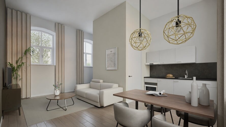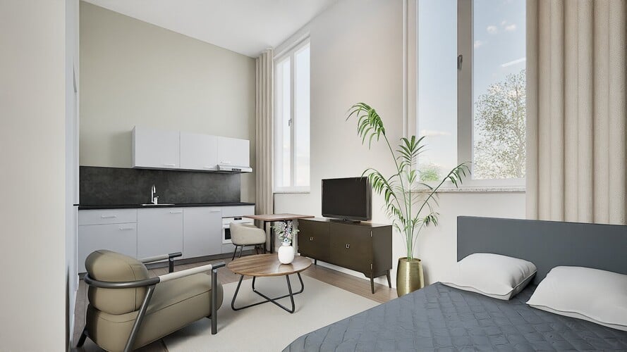 - Van 20m2 tot 79 m2 per studio inclusief badkamer en keuken. Gemeenschappelijke ontmoetingsruimtes van zo'n 400m²m²